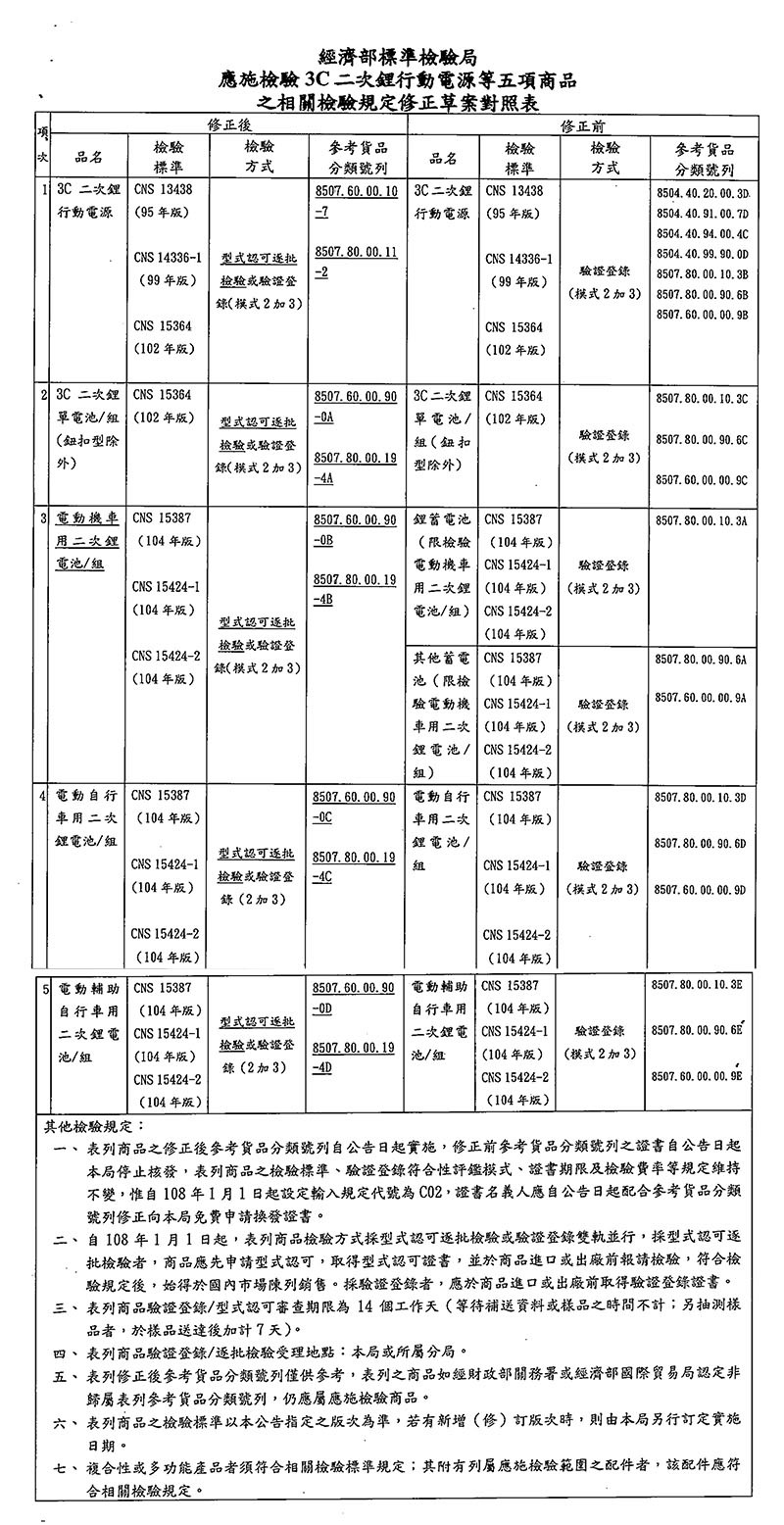 近日臺灣臺灣經濟部標準檢驗局BSMI,公告修改3C二次鋰電池與行動電源相對應之貨品分類號列 (C.C.C. Code),并改列為邊境管制商品,自2019年1月1日起實施。修正前參考貨品分類號列之證書將自公告日起停止核發,過去已核發的證書必須自公告日起依修正后參考貨品分類號列申請換發證書。