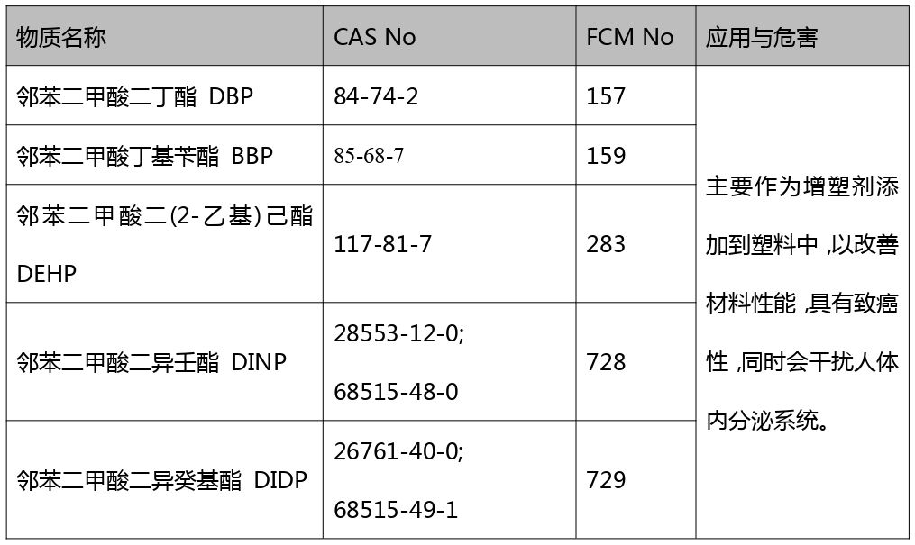 2019年12月11日,歐盟食品安全局(EFSA)官方網站發布一則消息稱,歐盟食品接觸材料、酶和加工助劑小組(CEF)應歐盟委員會要求,更新了五種被授權用于塑料類食品接觸的鄰苯二甲酸酯的風險評估,這五種鄰苯二甲酸酯包括DBP、BBP、DEHP、DINP、DIDP。