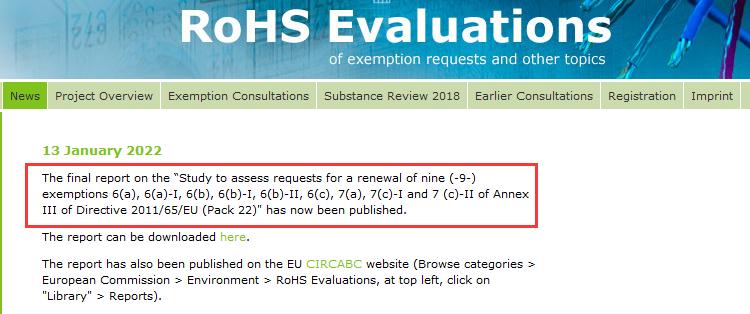 2022年1月13日,Oeko-Institut在其官網公布了RoHS 2.0指令(2011/65/EU)豁免Pack 22的最終評估報告,報告中針對附錄III的6(a), 6(a)-I, 6(b), 6(b)-I, 6(b)-II, 6(c), 7(a), 7(c)-I and 7 (c)-II的延期與否給出了相關建議,歐盟將參考此評估報告作出延期與否的最終決定。